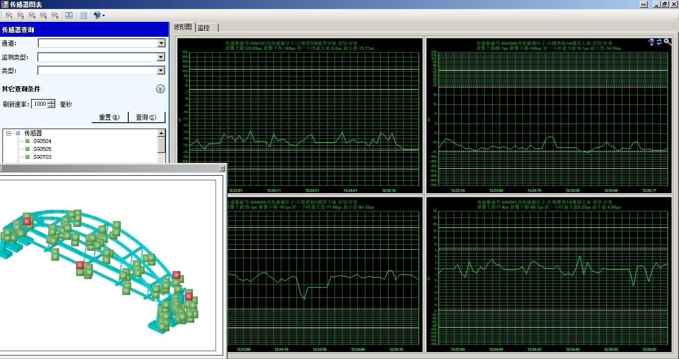 桥梁健康监控系统是基于光纤网络的桥梁实时监控子系统,应用于我市的青龙场立交桥、星辉桥、南河桥三座特殊结构桥梁,实现了对桥梁吊杆、系杆索力,应力(应变),桥址小气象和桥梁视频图像的实时监控,同时建立了结构变位的监控点位,能够定期对桥梁进行人工观测采集信息。当出现异常情况时(结构响应超限),系统将向中控中心发出报警信号,确定结构测值超限位置、大小,并将报警信息发送中控中心进行储存,由中心服务器进行统计分析,生成报表报送桥梁管理部门。同时,桥梁视频监控摄像机,也会记录该时刻的桥面荷载状况,便于管理人员将监控数据和视频图像进行对比分析及时做出桥梁管养决策。
